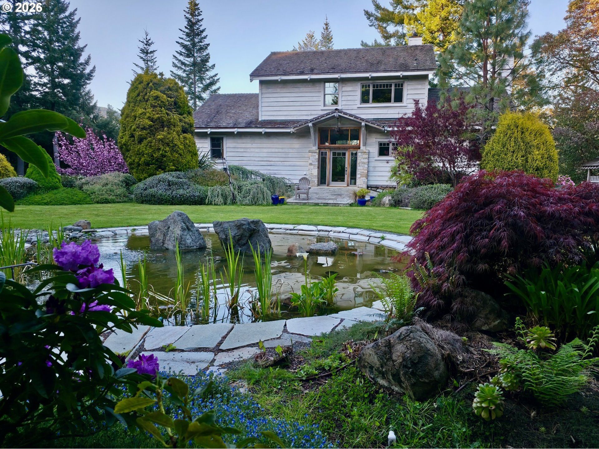 Perched on 42 pristine acres overlooking the Rogue River, this masterfully crafted estate blends architectural artistry with the untamed beauty of the Oregon coast. Surrounded by towering conifers, lush gardens, and meandering trails, the property offers unparalleled privacy, just a short distance from Gold Beach and the Pacific Ocean.Built entirely of local Port Orford Cedar, inside and out, the Japanese temple-inspired main residence is a showcase of meticulous craftsmanship. Vaulted, layered ceilings, 360? windows, and a dramatic stone fireplace define the living space, while a stone breezeway connects to the river-view porch, a library and study. The expansive master suite upstairs features a private fireplace, spa-like bath, and breathtaking views. Radiant floor heating and ductless climate control throughout, ensure comfort year-round.A glass Japanese greenhouse, crafted using traditional woodworking joinery techniques, sits beside the 2-bedroom guesthouse, while a caretaker's residence above a spacious workshop adds further versatility. Five fenced acres protect an abundant orchard of peach, apple, pear, fig, apricot, and kiwi trees, alongside raised beds, vibrant rose gardens, rhododendrons, Japanese maples, and a tranquil koi pond.With an abundant well (30+ GPM), low-tax forest grazing land, and direct access to nature, this extraordinary retreat is a rare fusion of seclusion, beauty, and refined living.